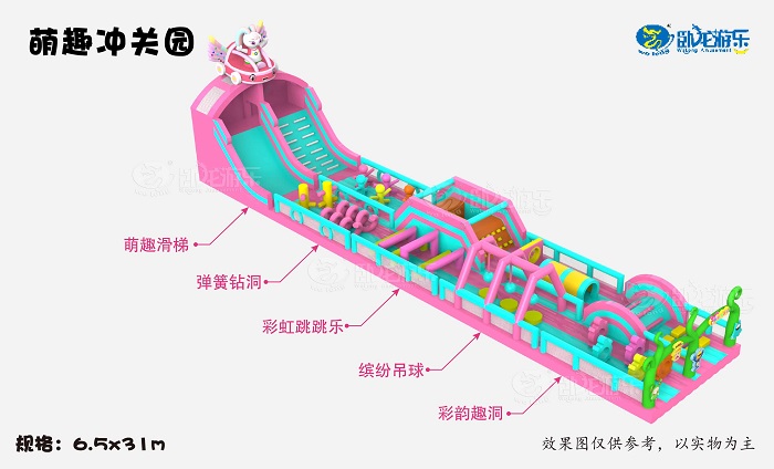 Designed like a fairy-tale candy world, this inflatable obstacle course integrates various interesting projects such as slides, puppet obstacles, and rock-climbing wooden bridges. It aims to inspire children’s spirit of exploration and courage, becoming a happy companion on their growth journey.