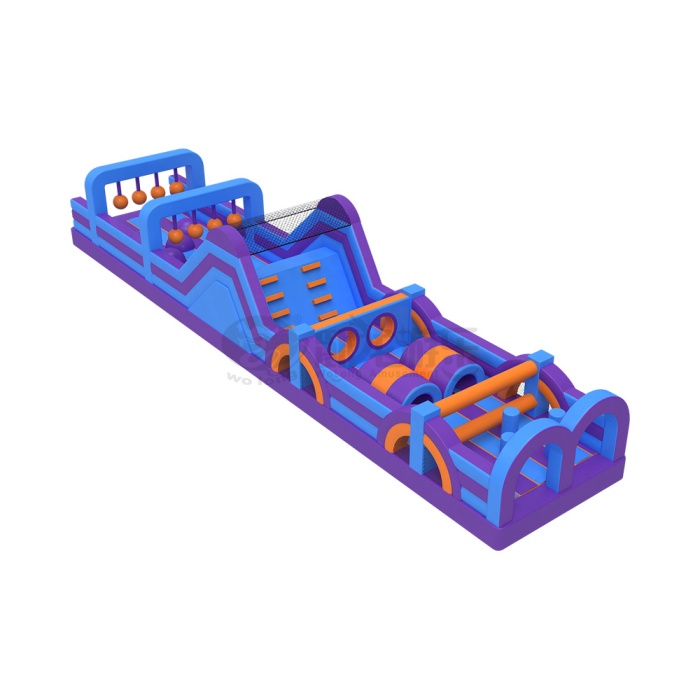 Designed with a dreamy blue-purple base and vibrant orange accents, the course boasts a playful, futuristic look that’s impossible to resist. Start your journey by dodging the swinging hanging balls, testing your agility and reflexes. Next, tackle the steep climbing wall, where you’ll need to use both hands and feet to conquer the slope. After reaching the top, navigate through a series of fun tunnels and rolling barrels that will have you laughing as you spin and weave your way through. Finally, cross the bouncy archway at the finish line to cap off your epic challenge.